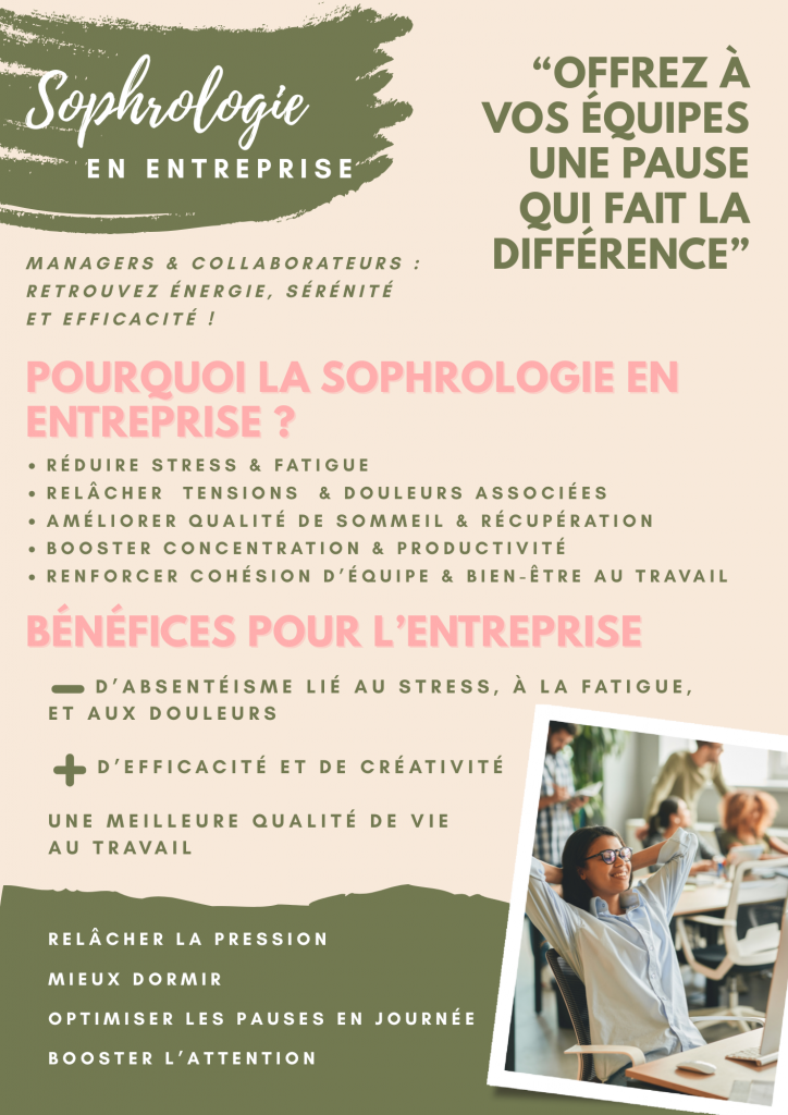 La sophrologie s’inscrit dans les démarches QVCT (Qualité de Vie et Conditions de Travail), la prévention des RPS (Risques Psycho-Sociaux) et des TMS (Troubles Musculo Squelettiques).